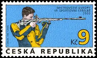 1993 1994 1995 1996 1997 1998 1999 2000 2001 2002 2003 2004 2005 2006 2007 2008 2009 2024 2025 345 346 347-348 349 350 351-352 353 354 355-356 357 358 359-360 361 362 363 364-367 369-369 370 371-373 374-376 377-378 379-380 381 382-384 385 Znaczki – rok 2003 Znaczki – rok 2003 Przegląd znaczków 2003 Przegląd bloków 2003 Przegląd arkusików 2003 Mistrzostwa Europy w strzelaniu 25.06 2003 Technika druku:staloryt + rotograwiura Projekt:Kryštof KrejcaPavel Kovarík Ząbkowanie:ZG 11¾:11¼ Arkusz sprzedażny:50 znaczków Format znaczka:40 x 23 mm Papier:fluorescencyjny 361 MichelPofisNominałKolorCena **Cena ⭘Nakład3613629 Kčwielobarwny9,001 000 000