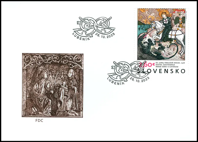 W IKONOGRAFII święty ukazywany jest w krótkiej tunice jako rycerz na koniu zabijający smoka.